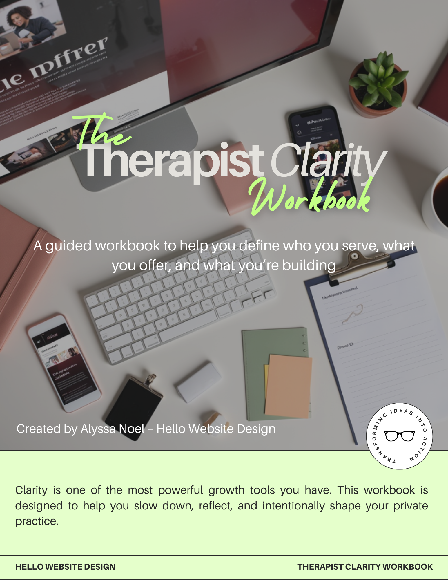 Clarity is one of the most powerful tools in private practice growth. The Therapist Clarity Workbook is a guided reflection tool designed to help you clearly define who you want to work with, what you most want to help with, and how you want your practice to support your life.